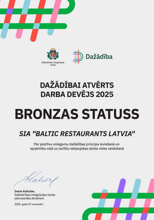 Mēs ticam, ka darbs īstenā komandā ir vieta, kur katrs jūtas piederīgs un tagad to atzinīgi novērtē arī nozares pārstāvji. Baltic Restaurants Latvia saņēma atzinību kategorijā „Iesaiste un dialogs” konkursā „Dažādībā ir spēks”.